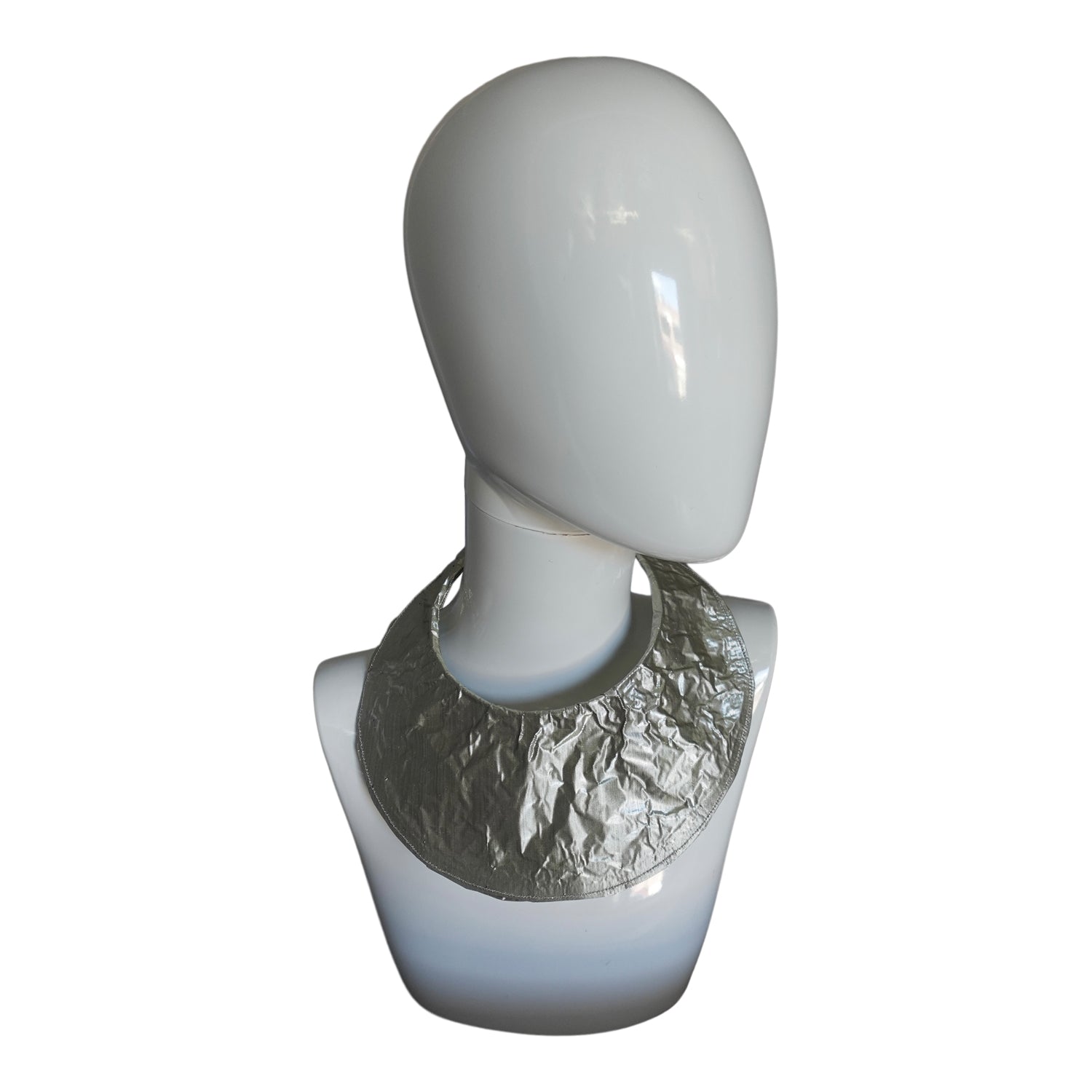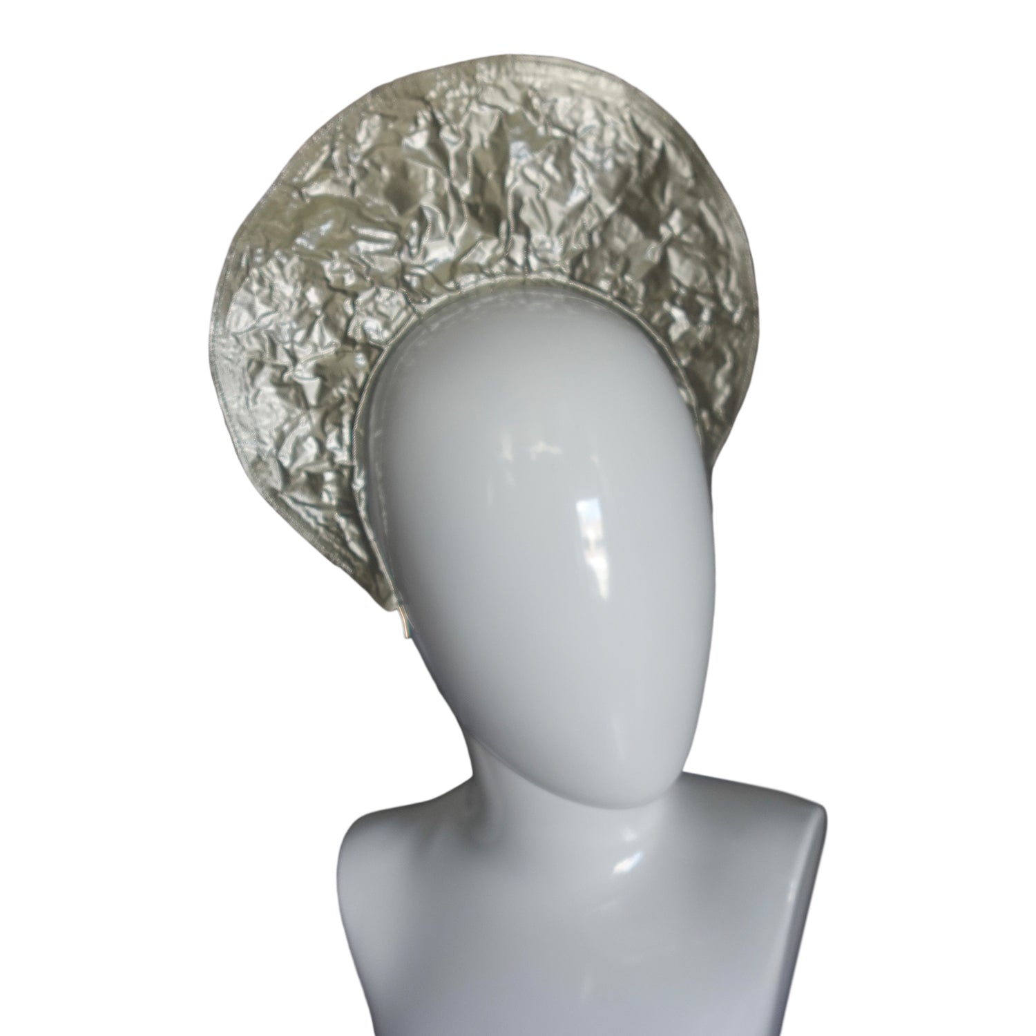This "MORPHY" halo headband is moldable and super light weight. The metallic silk shantung has the look of hammered precious metal. One size fits all.
