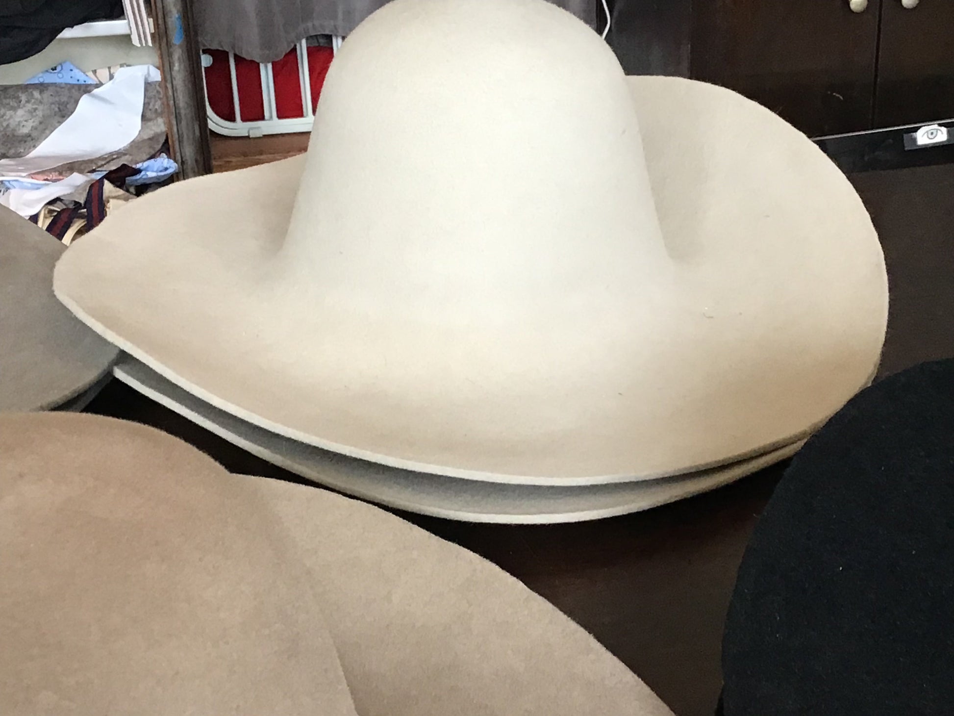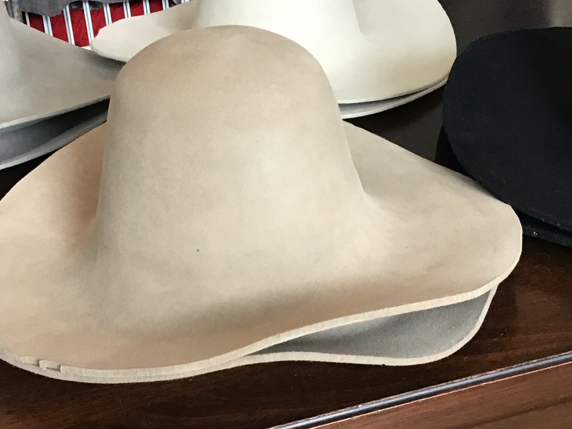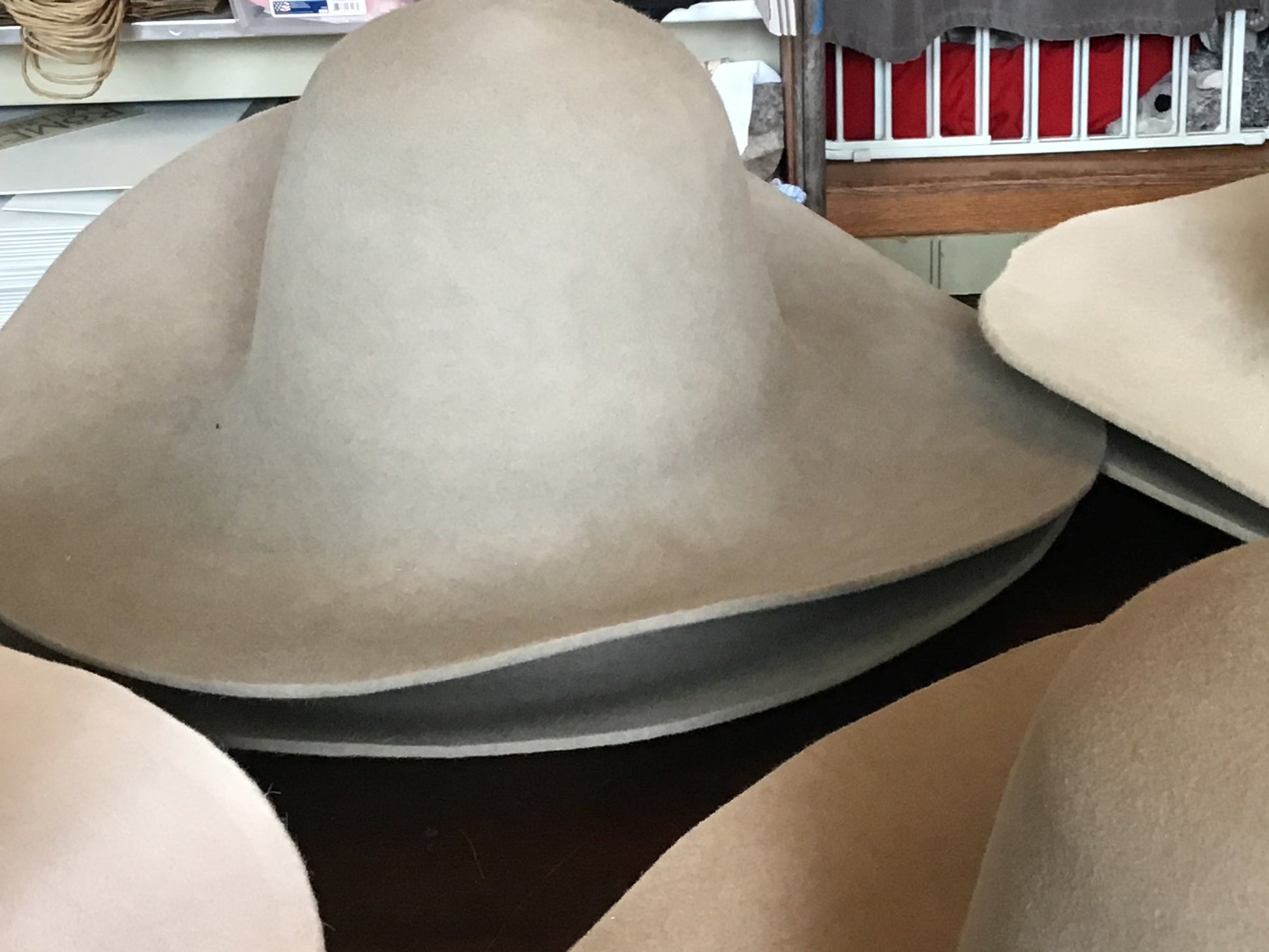 Selling 14 western weight fur felts in 5 different colors. VERY heavy weight, presized. 2 black, 2 alabaster, 2 lt camel, 6lt silver, 2 lt mink. Colors are not exact, just cant get the color right. LEFT TO RIGHT: