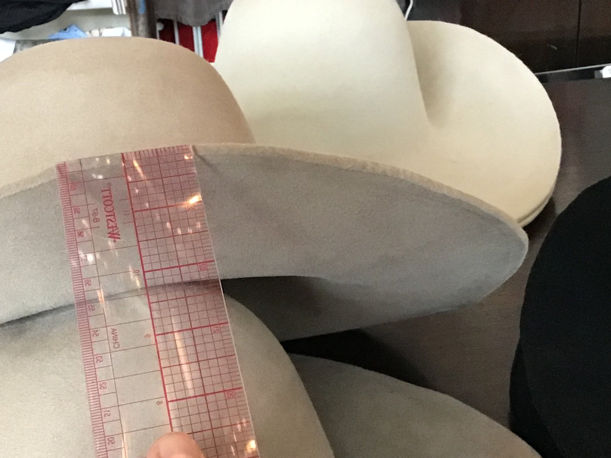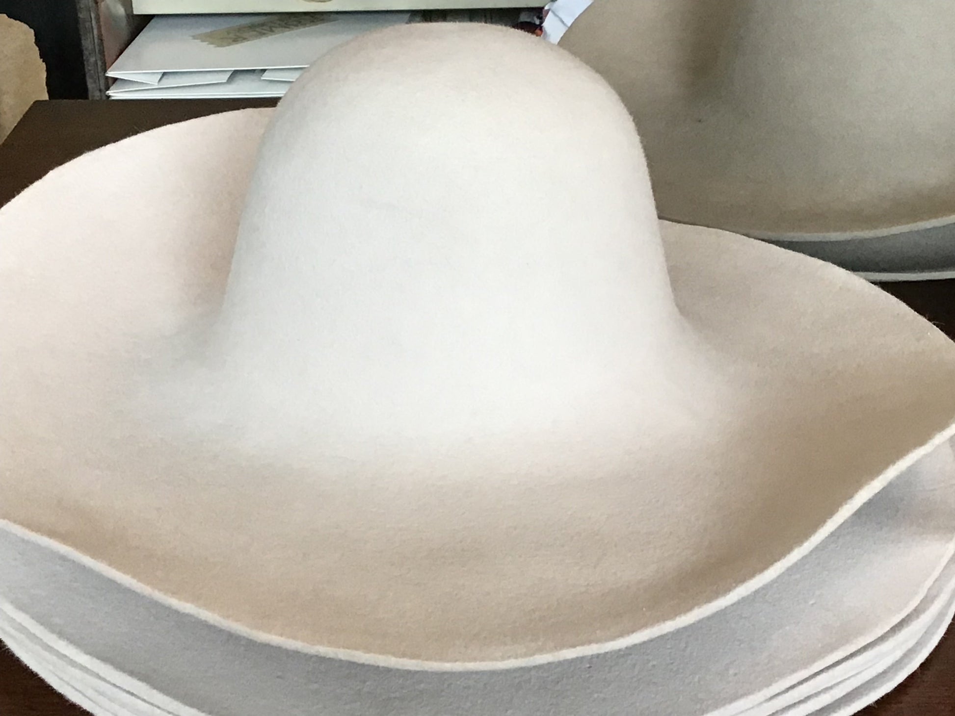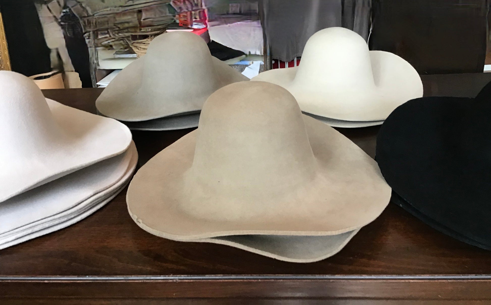 Selling 14 western weight fur felts in 5 different colors. VERY heavy weight, presized. 2 black, 2 alabaster, 2 lt camel, 6lt silver, 2 lt mink. Colors are not exact, just cant get the color right. LEFT TO RIGHT: