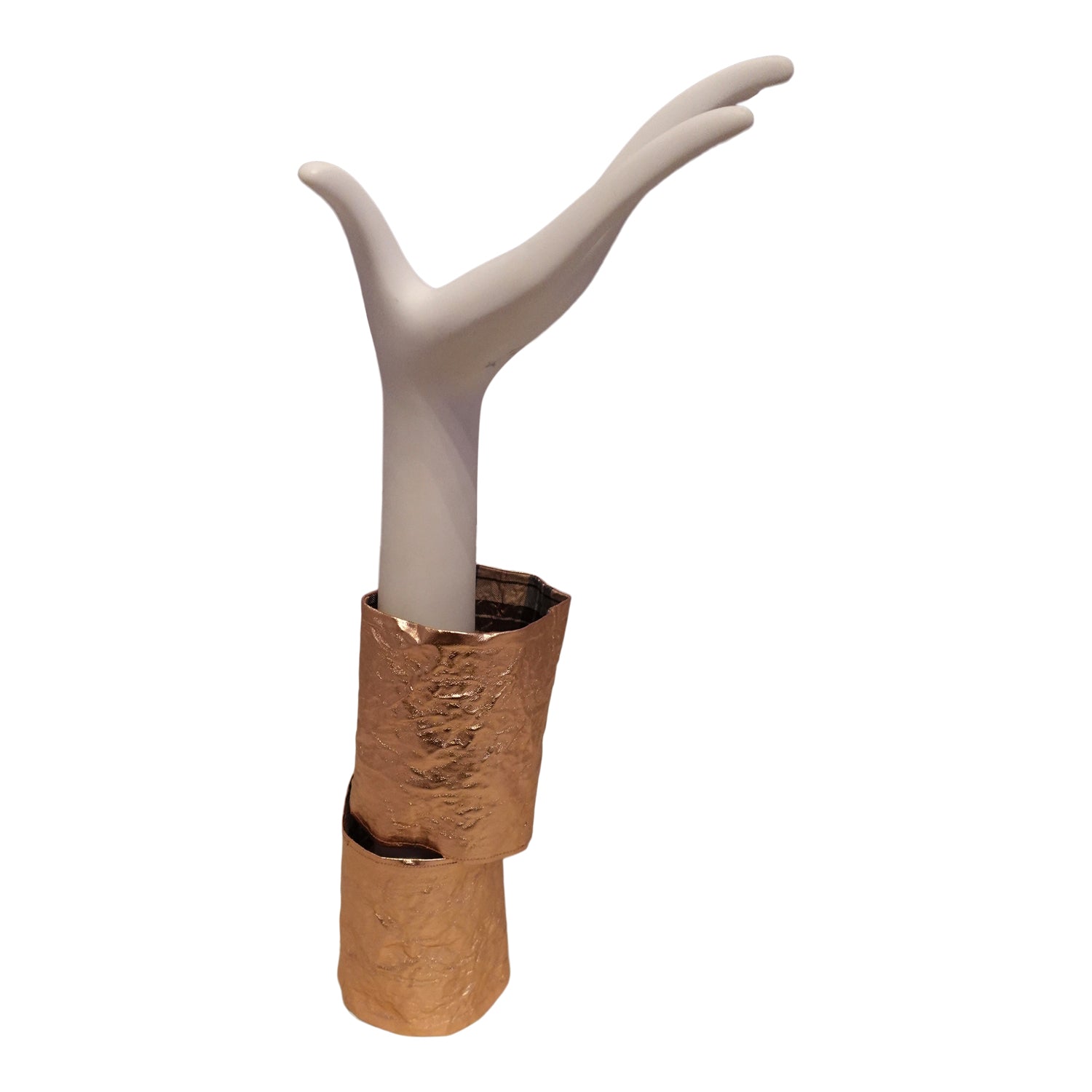 This "MORPHY" cuff is moldable to fit different sizes. Depending on your arm size, it can be a upper arm band or a wrist cuff. It has the look of rough hewn metal while it is super light weight and flexible. This band is 5.5" long and 11" circ inside. They pack flat for easy travel. The lightest cuff ever!