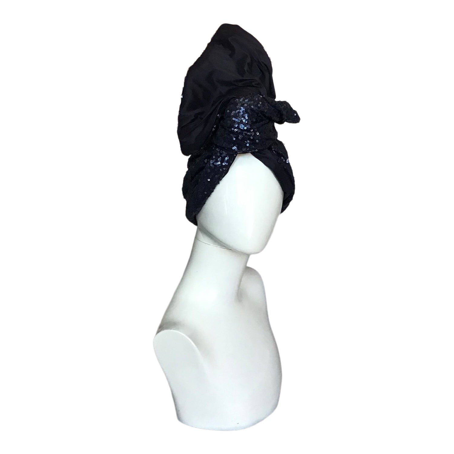 Dark Navy and sequins make this Twisturban an alternative to black. The silk is reflective and light, while the sequin reads "Hollywood glamour". Ships with a matching sack. Sewn 2/23/23