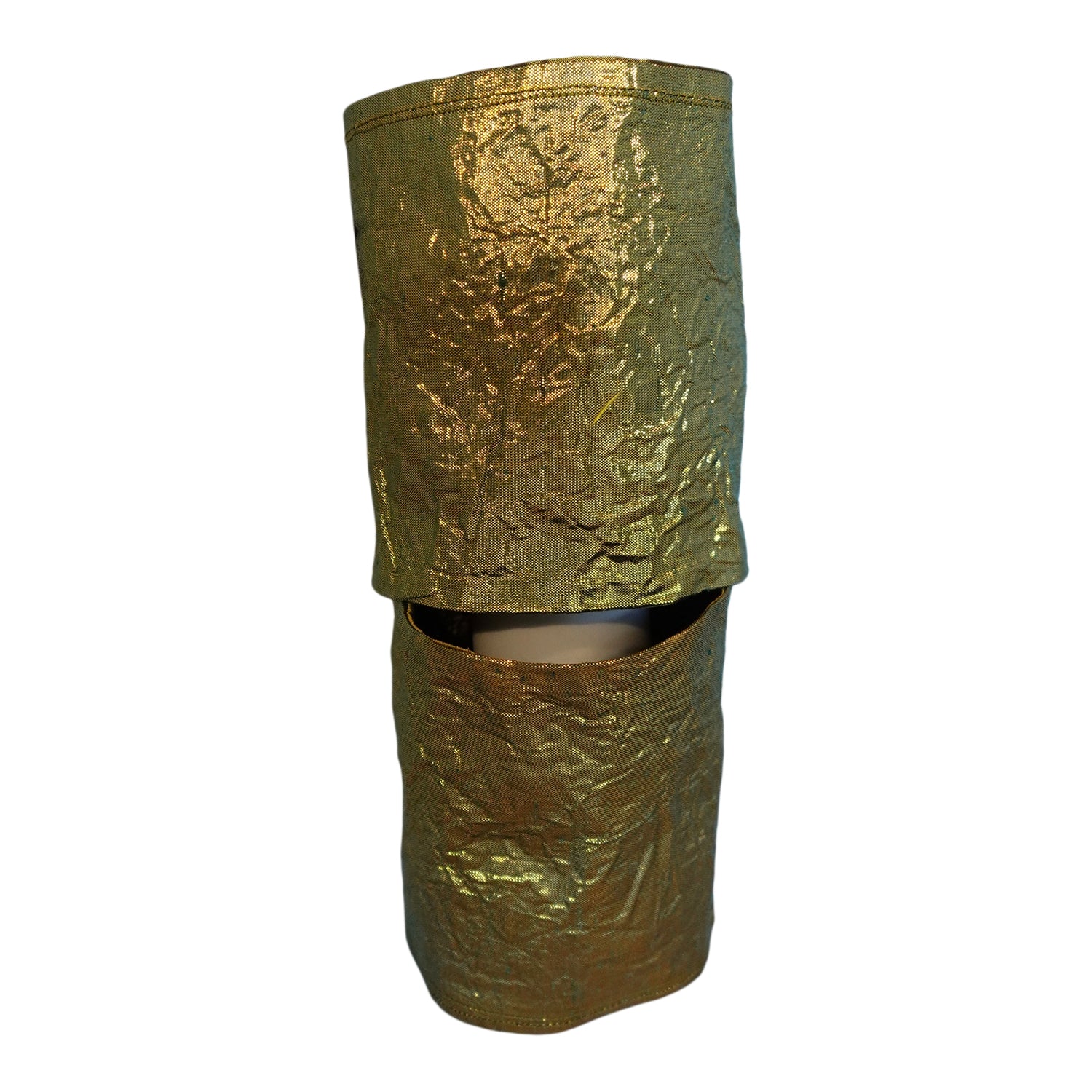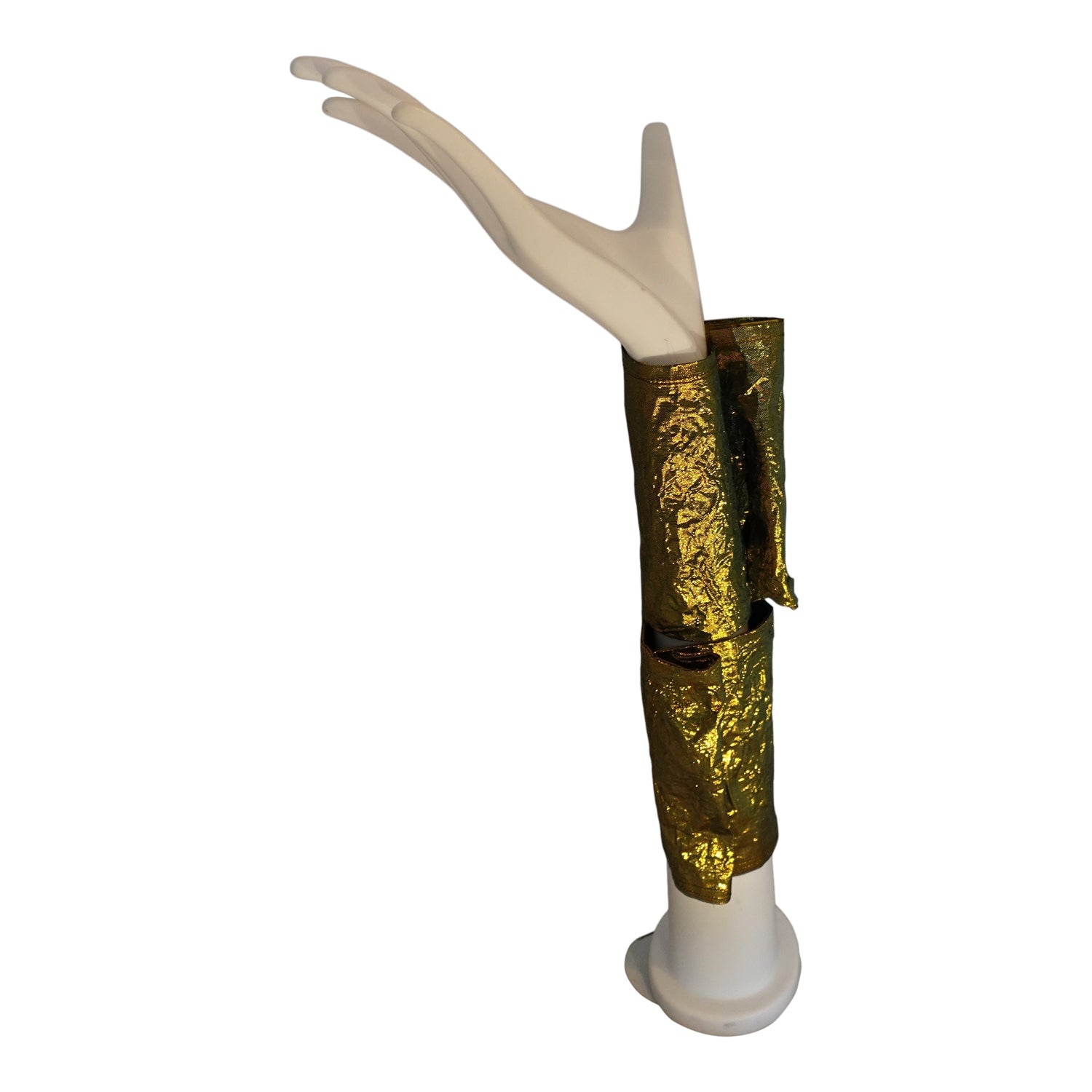 This "MORPHY" cuff is moldable to fit different sizes. Depending on your arm size, it can be a upper arm band or a wrist cuff. It has the look of rough hewn metal while it is super light weight and flexible. Interior is olive silk taffeta. This band is 6" long and 11" circ inside.