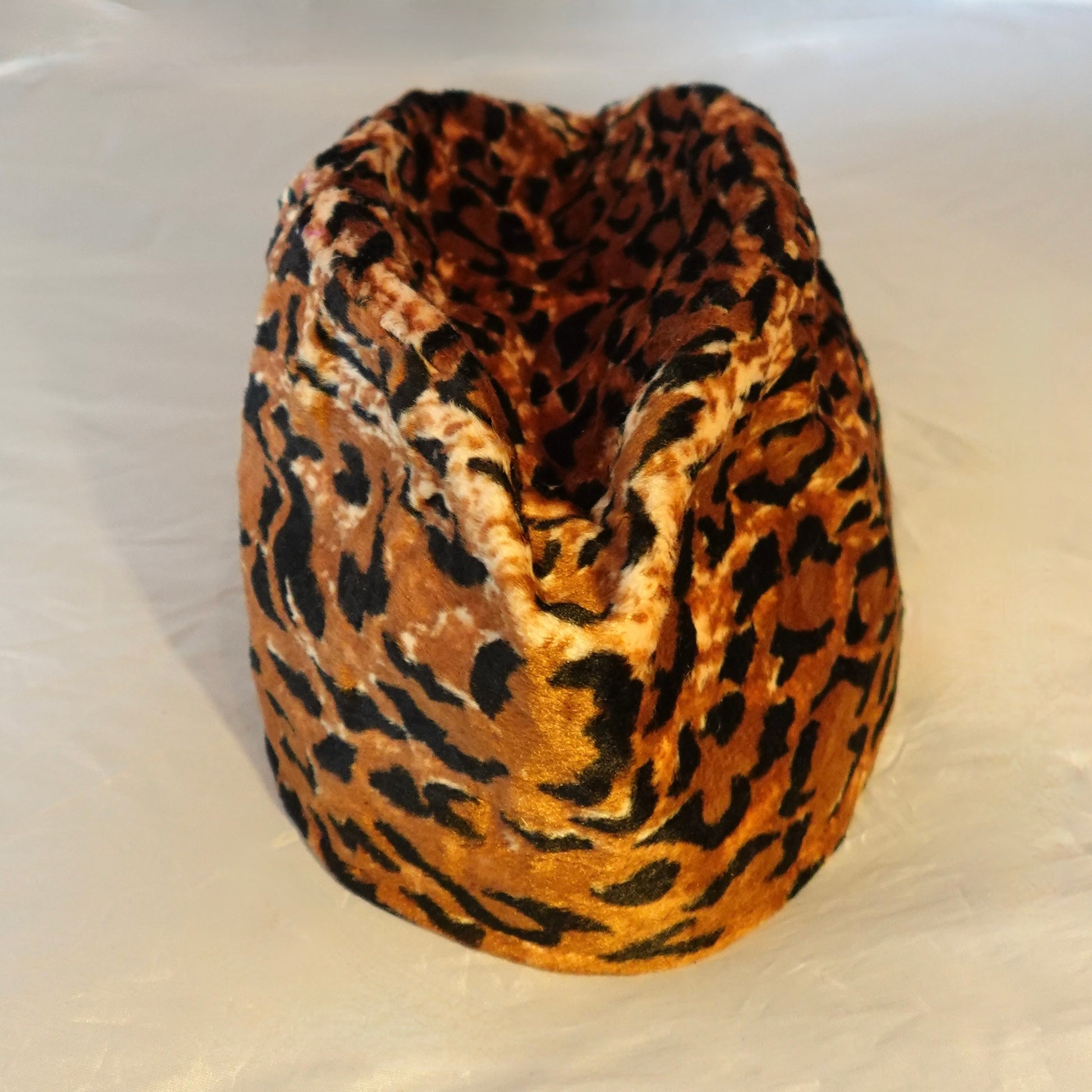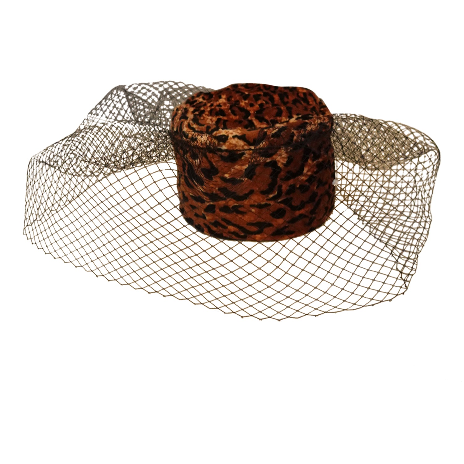 This "MORPHY" hat is the new hat you need. It is completely moldable into different styles. As you morph, so does your hat. This pillbox hat is leopard print velvet lined in pink silk. It can be shaped into a garrison cap. It comes with a removable veil on elastic that can be worn on its own. Dress it up with a veil when you choose.