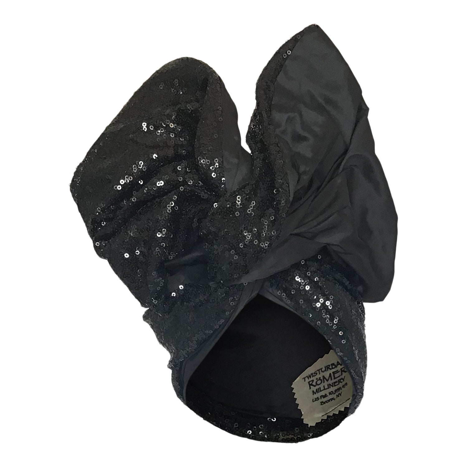 This Medium sized Twisturban is about 42" long. One side of silk shantung and one side of sequins. The black sequins has a more subtle glitter. Ships with a matching sack. Sewn Dec 24, 2021